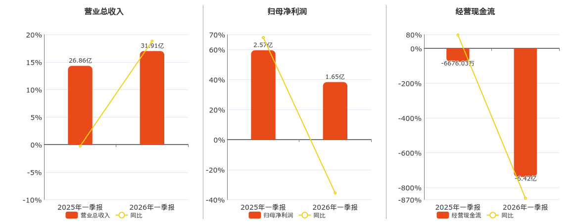 公司营业总收入为31.91亿元。归母净利润为1.65亿元,较去年同报告期归母净利润减少9143.65万元,同比较去年同期下降35.61%。经营活动现金净流入为-6.42亿元,较去年同报告期经营活动现金净流入减少5.75亿元。