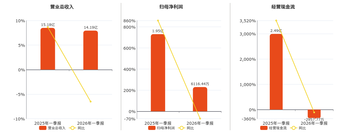 公司营业总收入为14.19亿元,较去年同报告期营业总收入减少9885.13万元,同比较去年同期下降6.51%。归母净利润为6116.44万元,较去年同报告期归母净利润减少1.34亿元,同比较去年同期下降68.59%。经营活动现金净流入为-2957.77万元,较去年同报告期经营活动现金净流入减少2.78亿元,同比较去年同期下降111.90%。