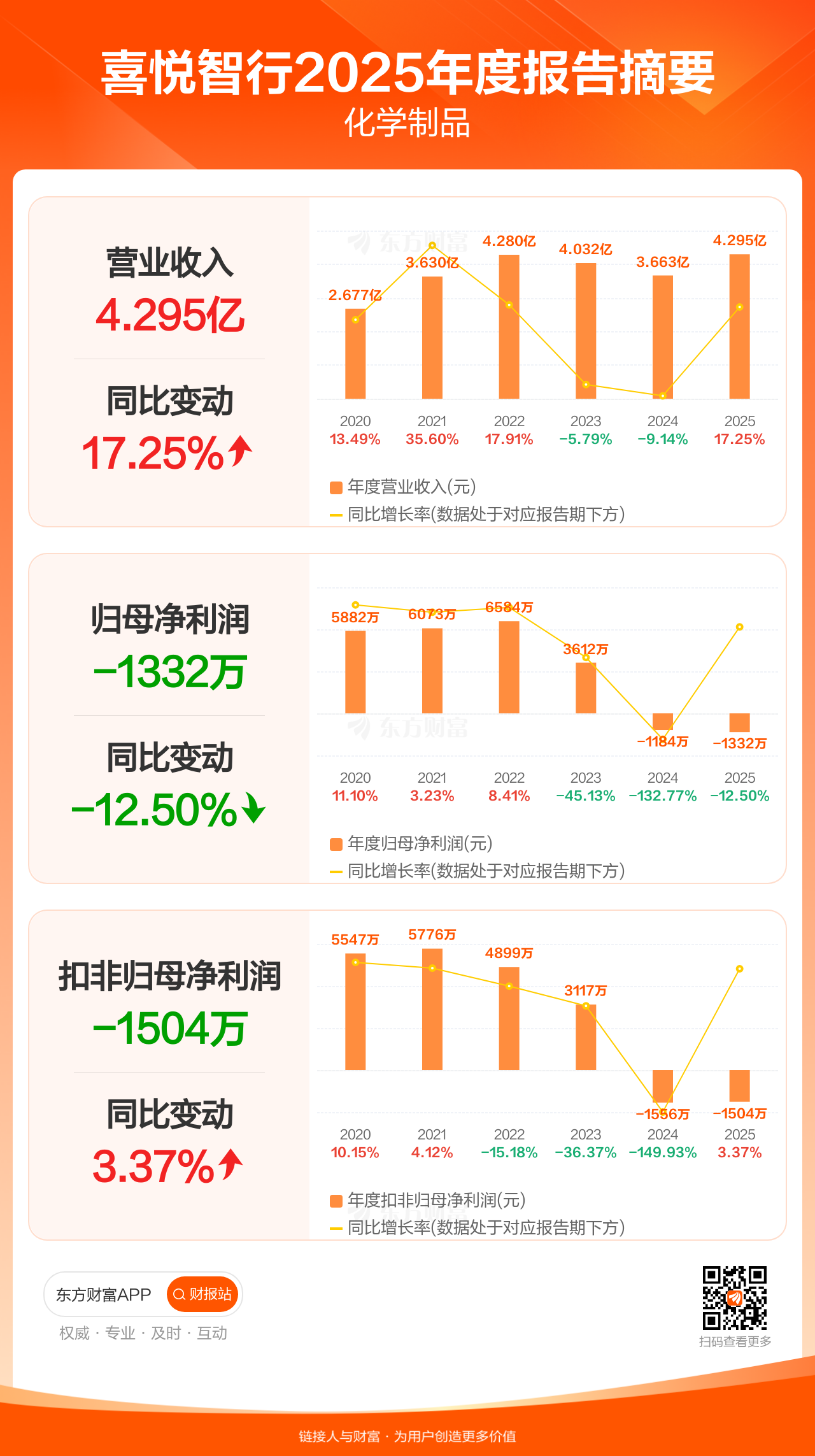喜悦智行4月28日发布2025年年报显示,公司全年实现营业收入4.30亿元,同比增长17.25%;归母净利润-1331.69万元;扣非归母净利润-1503.90万元。