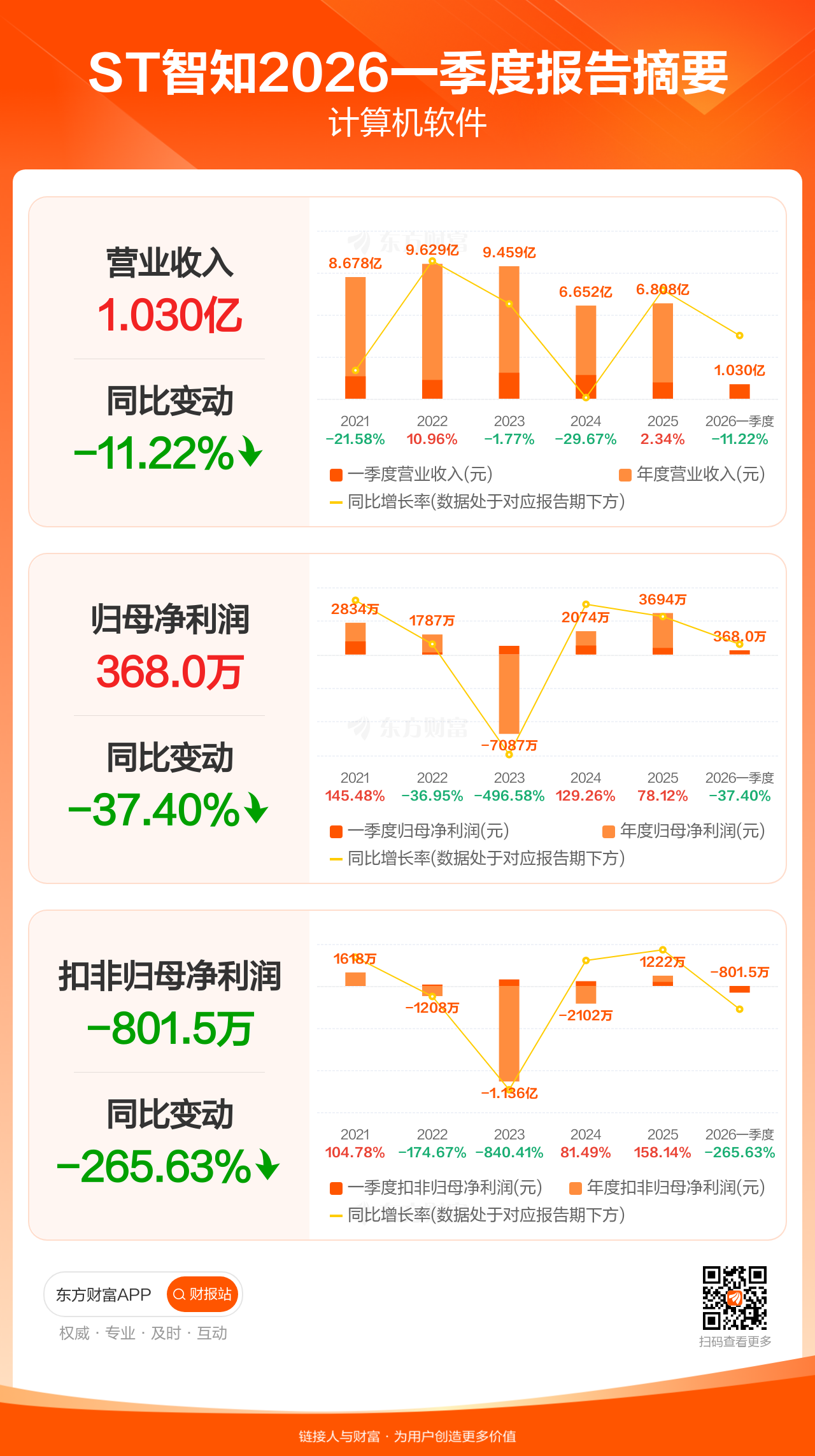 ST智知4月28日发布2026年一季报显示,公司一季度实现营业收入1.03亿元,同比下滑11.22%;归母净利润367.95万元,同比下滑37.40%;扣非归母净利润-801.48万元。