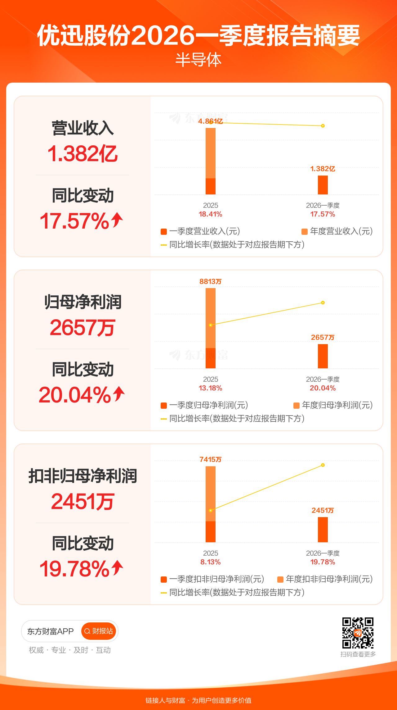 优迅股份4月28日发布2026年一季报显示,公司一季度实现营业收入1.38亿元,同比增长17.57%;归母净利润2657.43万元,同比增长20.04%;扣非归母净利润2451.17万元,同比增长19.78%。