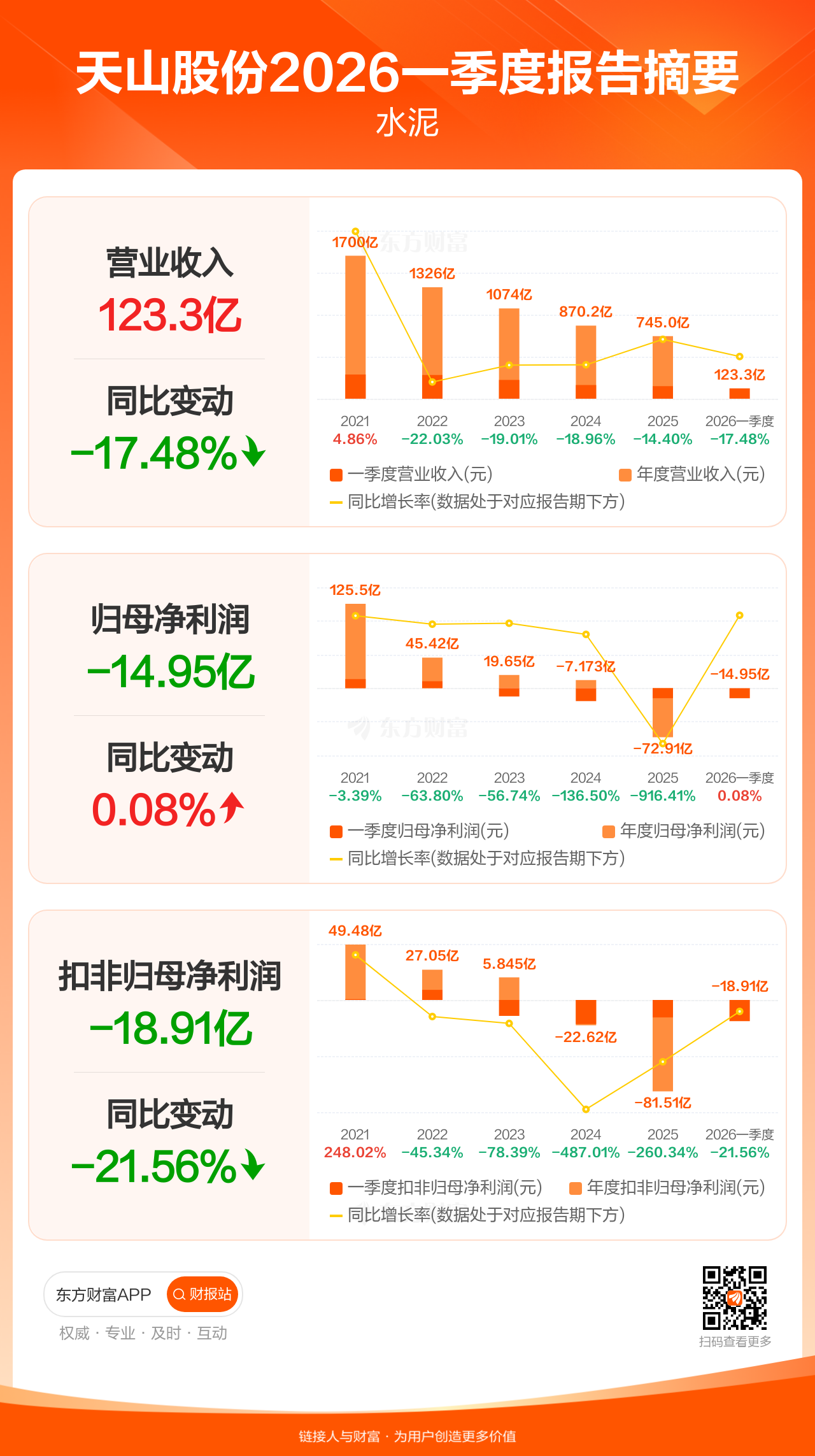 天山股份4月28日发布2026年一季报显示,公司一季度实现营业收入123.34亿元,同比下滑17.48%;归母净利润-14.95亿元;扣非归母净利润-18.91亿元。