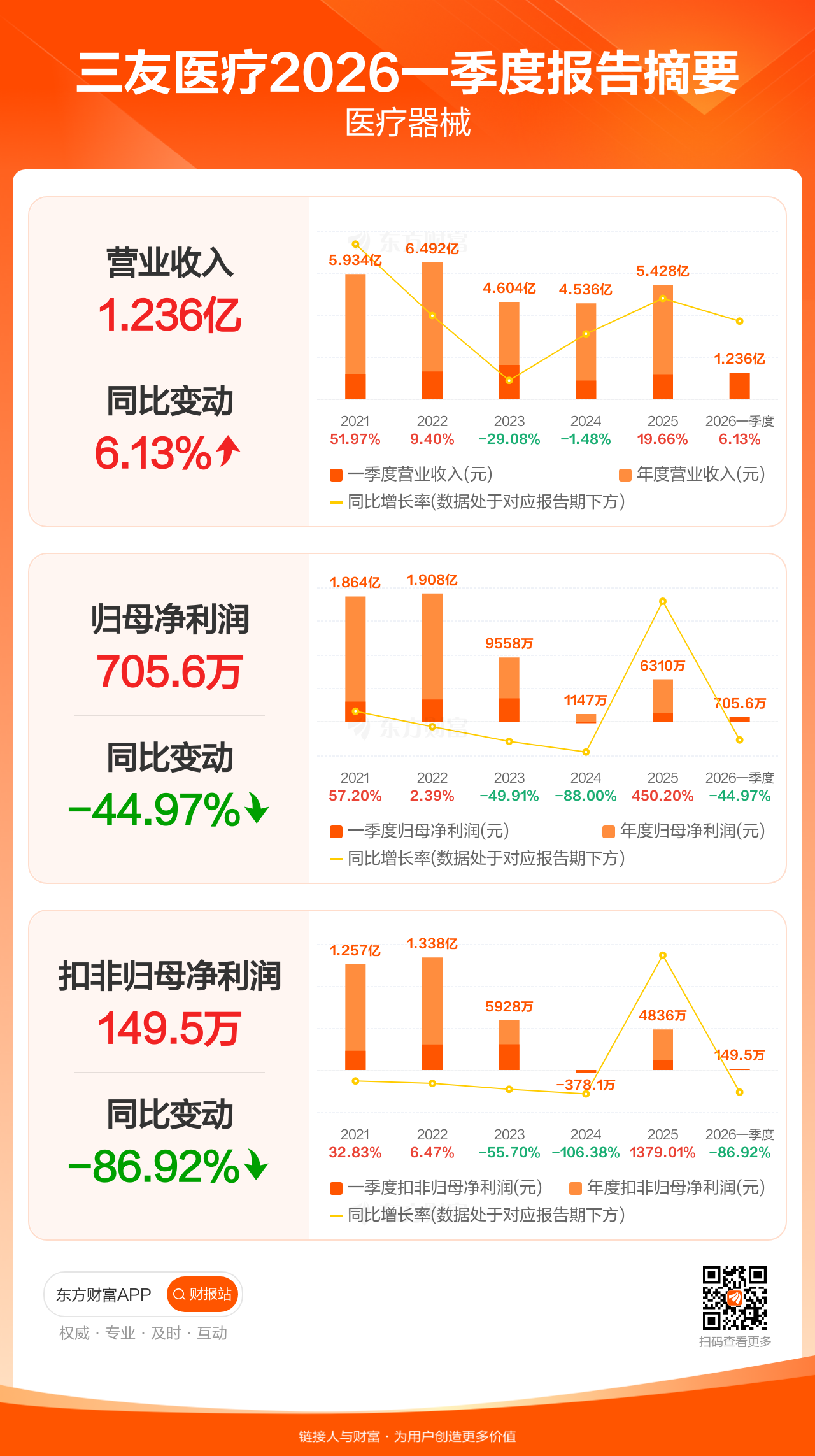三友医疗4月28日发布2026年一季报显示,公司一季度实现营业收入1.24亿元,同比增长6.13%;归母净利润705.61万元,同比下滑44.97%;扣非归母净利润149.50万元,同比下滑86.92%。