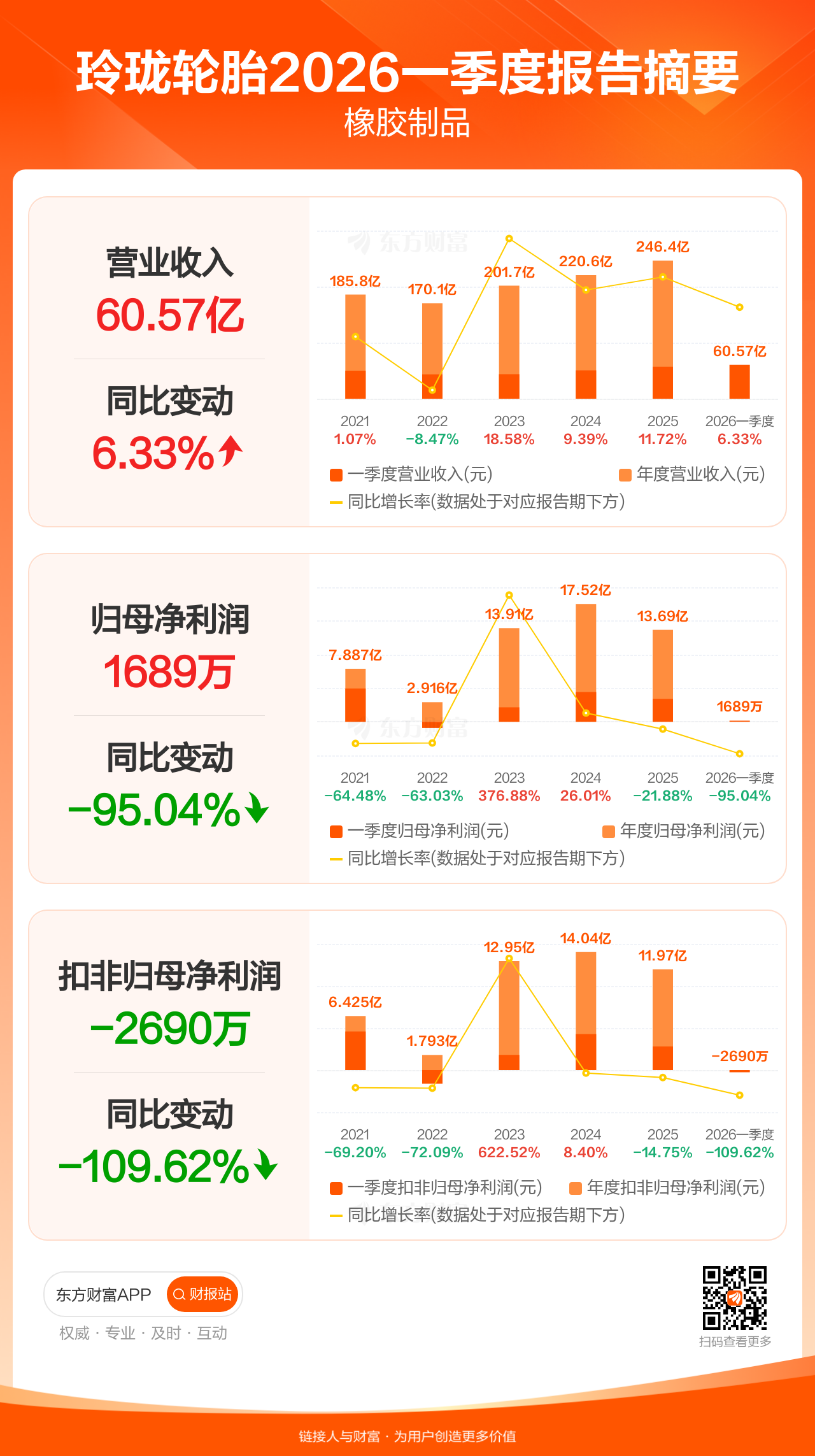 玲珑轮胎4月28日发布2026年一季报显示,公司一季度实现营业收入60.57亿元,同比增长6.33%;归母净利润1689.35万元,同比下滑95.04%;扣非归母净利润-2689.59万元。