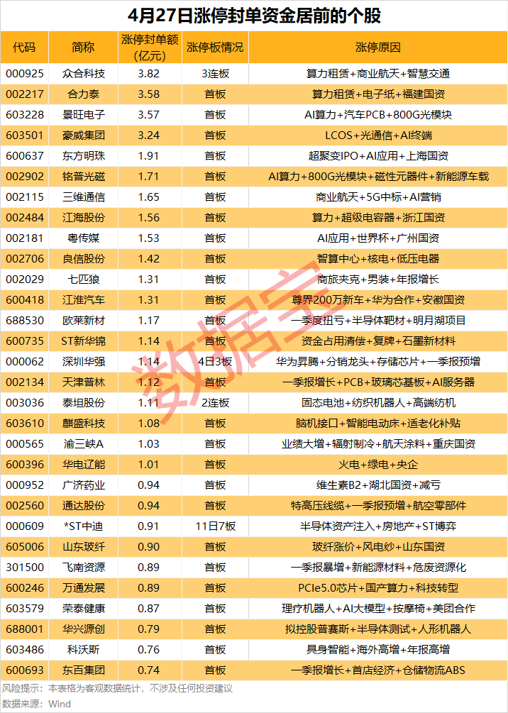 从连续涨停天数看,*ST岩石已连收7个涨停板,连续涨停板数量最多。以封单金额计算,众合科技、合力泰、景旺电子等涨停板封单资金居前,分别有3.82亿元、3.58亿元、3.57亿元。