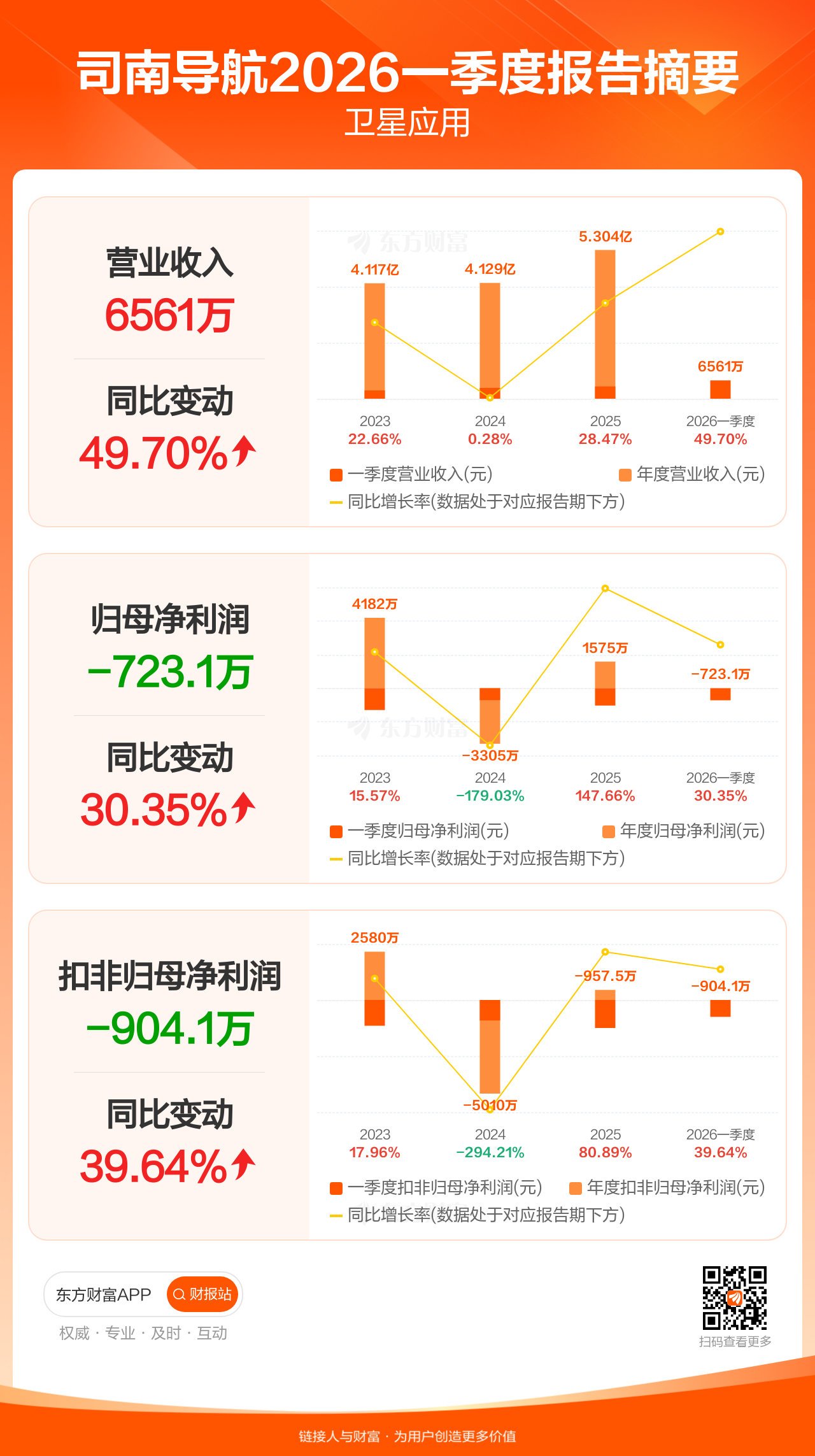 司南导航4月28日发布2026年一季报显示,公司一季度实现营业收入6560.73万元,同比增长49.70%;归母净利润-723.07万元;扣非归母净利润-904.15万元。