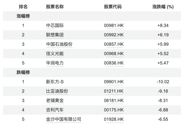 龙头股表现方面,中芯国际(+8.34%)、联想集团(+6.19%)、中国石油股份(+5.99%)领涨;新东方-S(-10.02%)、比亚迪股份(-9.16%)、老铺黄金(-8.31%)下跌明显。
