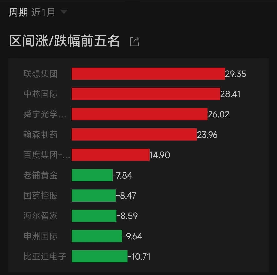 (过去一月恒生指数成分股涨跌幅前五;来源Wind)