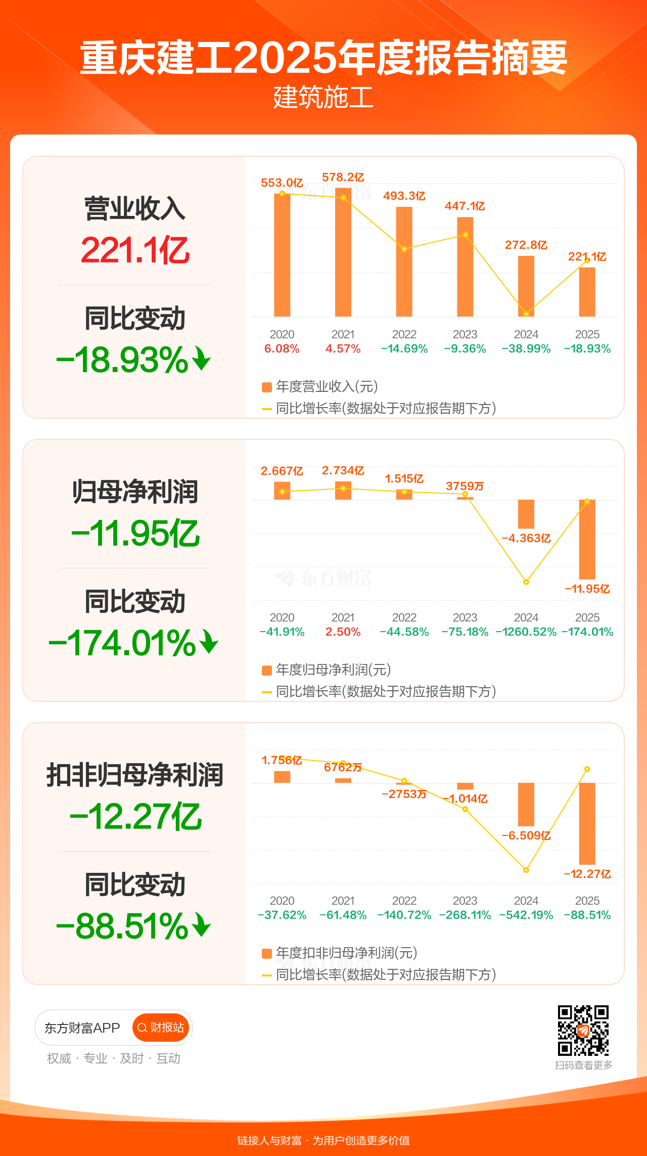 重庆建工4月28日发布2025年年报显示,公司全年实现营业收入221.15亿元,同比下滑18.93%;归母净利润-11.95亿元;扣非归母净利润-12.27亿元。