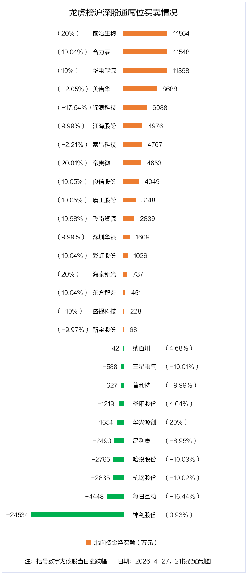 4月27日,北向资金参与龙虎榜中的个股共有27只,合计净买入3.66亿元。其中沪股通净买入8 股,净卖出4 股,合计净买入3.81亿元;深股通净买入9 股,净卖出6 股,合计净卖出1501.78万元。