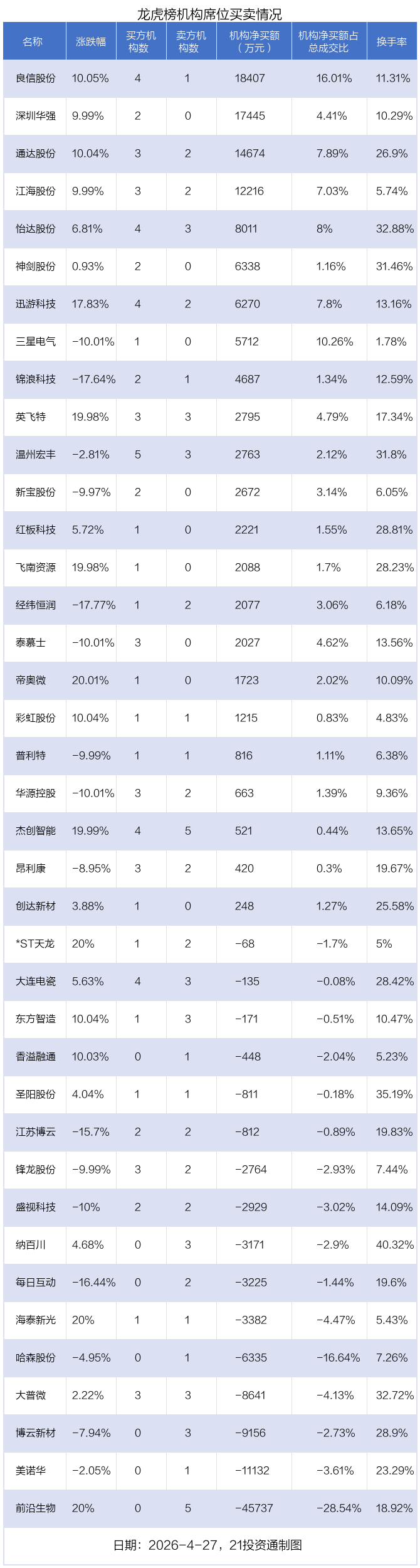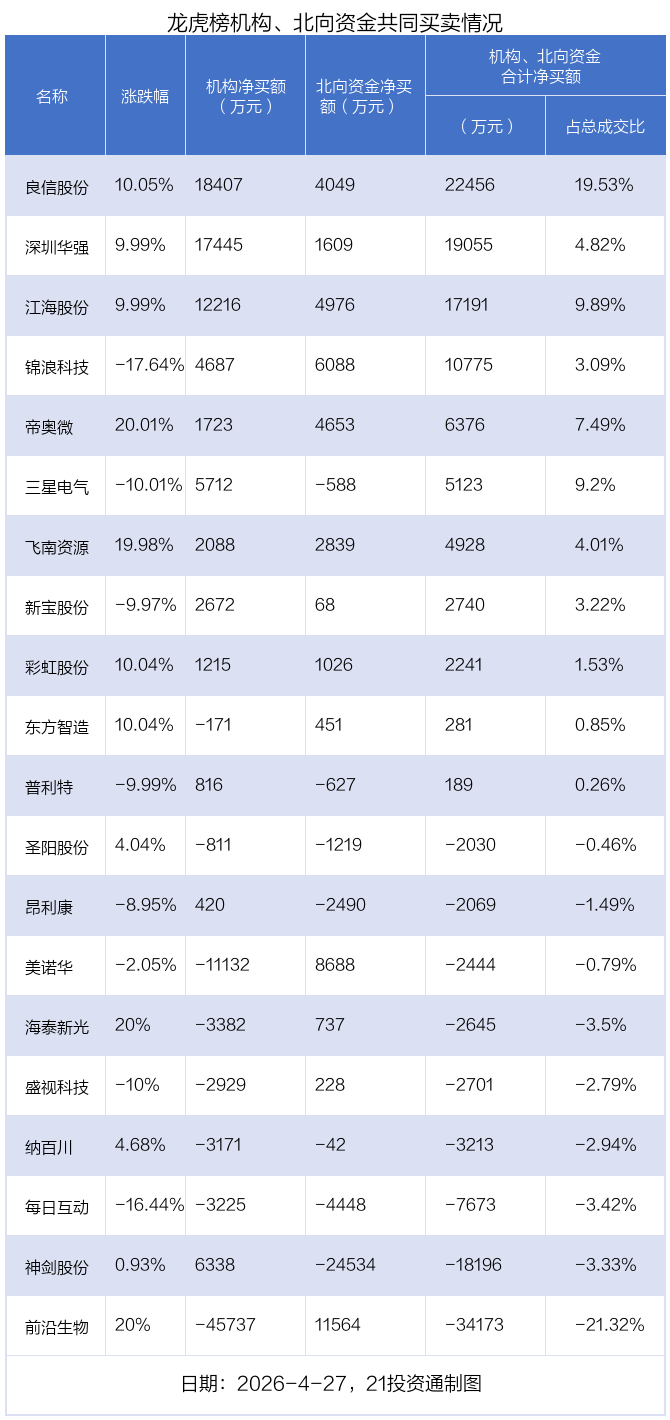 4月27日,39只个股龙虎榜出现了机构的身影,机构合计净买入1.71亿元。具体来看,机构净买入23股,净卖出16股。
