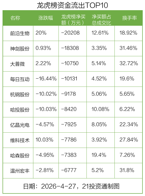 而龙虎榜中资金净流出最多的是前沿生物(688221.SH),被净卖出为2.02亿元,占总成交金额的12.61%。前沿生物收盘上涨20%,换手率为18.92%。