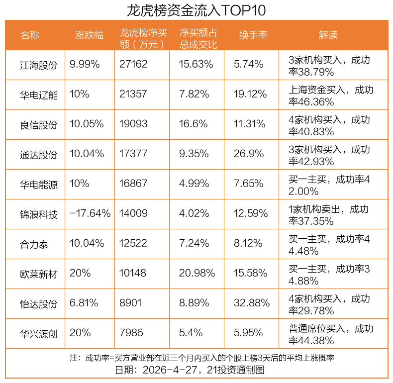4月27日,上证指数上涨0.16%,深证成指上涨0.37%,创业板指下跌0.52%。盘后龙虎榜数据显示,共有58只个股因当日异动登上龙虎榜,资金净流入最多的是江海股份(002484.SZ),达2.72亿元。