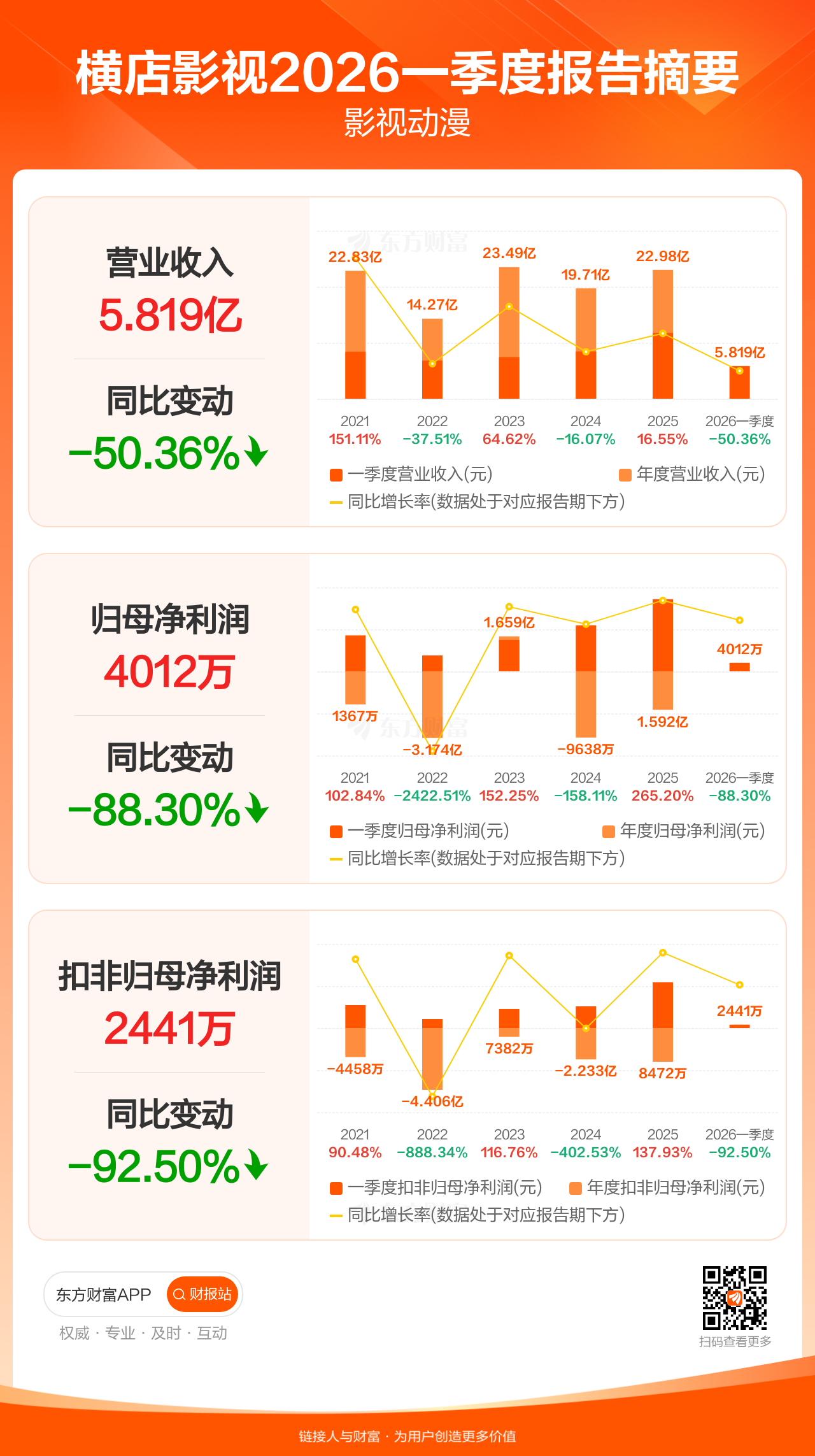 横店影视4月28日发布2026年一季报显示,公司一季度实现营业收入5.82亿元,同比下滑50.36%;归母净利润4012.24万元,同比下滑88.30%;扣非归母净利润2441.08万元,同比下滑92.50%。