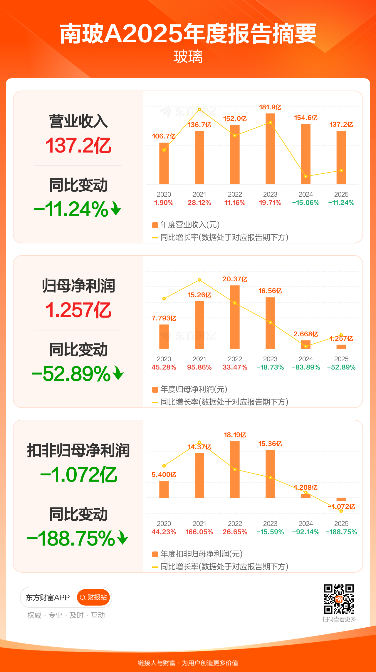 南玻A4月28日发布2025年年报显示,公司全年实现营业收入137.19亿元,同比下滑11.24%;归母净利润1.26亿元,同比下滑52.89%;扣非归母净利润-1.07亿元。