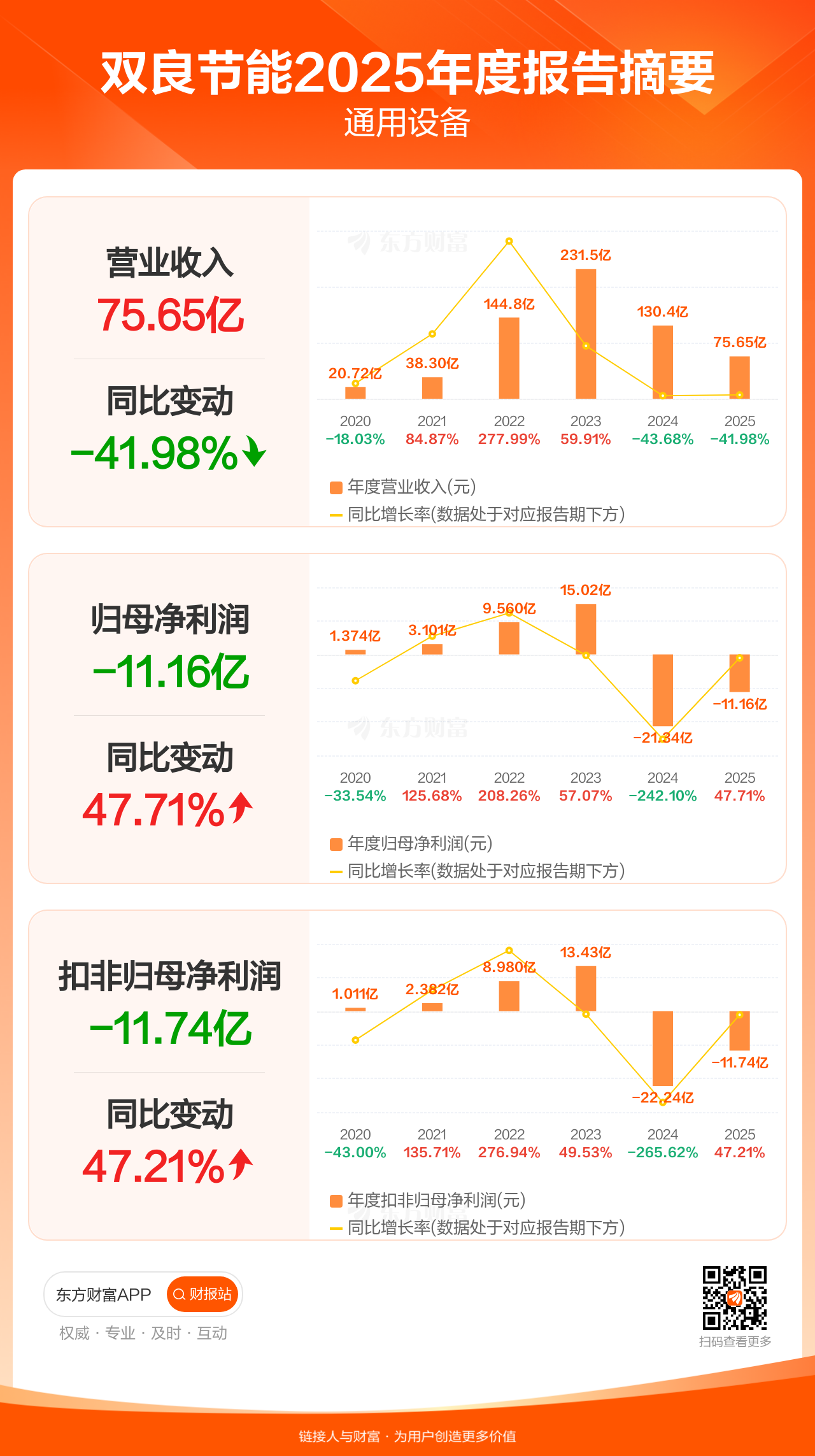 双良节能4月28日发布2025年年报显示,公司全年实现营业收入75.65亿元,同比下滑41.98%;归母净利润-11.16亿元;扣非归母净利润-11.74亿元。