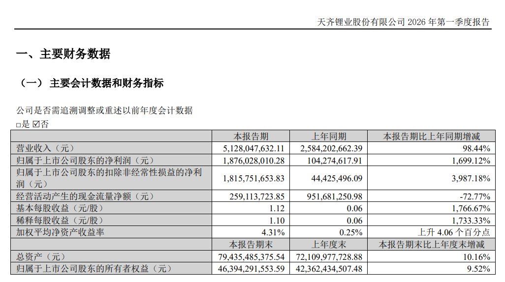 天齐锂业:一季度净利润18.76亿元 同比增长1699.12%