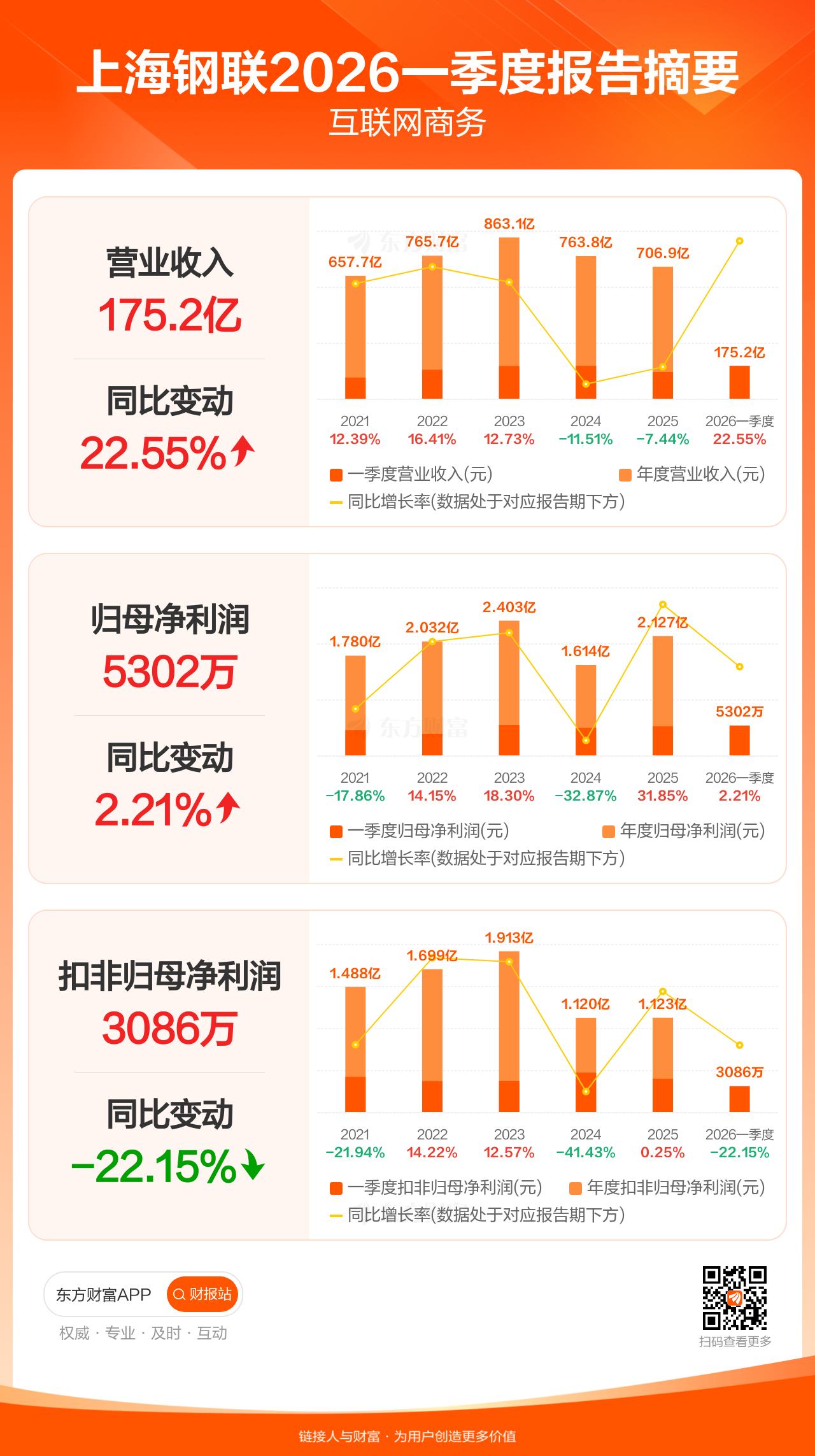 上海钢联4月28日发布2026年一季报显示,公司一季度实现营业收入175.19亿元,同比增长22.55%;归母净利润5302.16万元,同比增长2.21%;扣非归母净利润3085.91万元,同比下滑22.15%。
