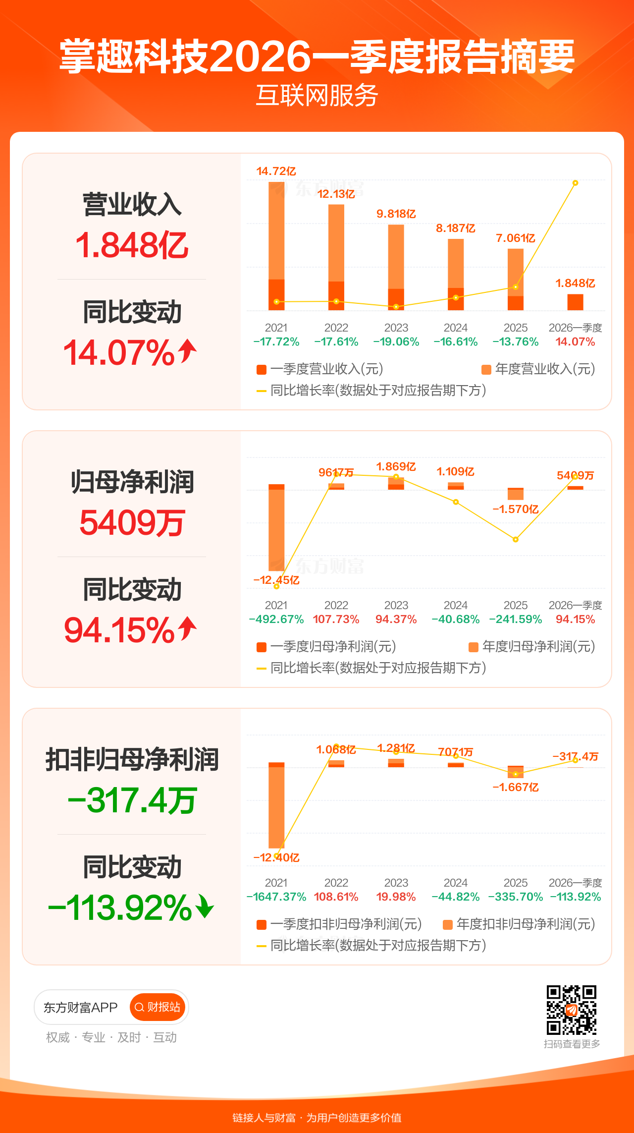 掌趣科技4月28日发布2026年一季报显示,公司一季度实现营业收入1.85亿元,同比增长14.07%;归母净利润5409.11万元,同比增长94.15%;扣非归母净利润-317.37万元。