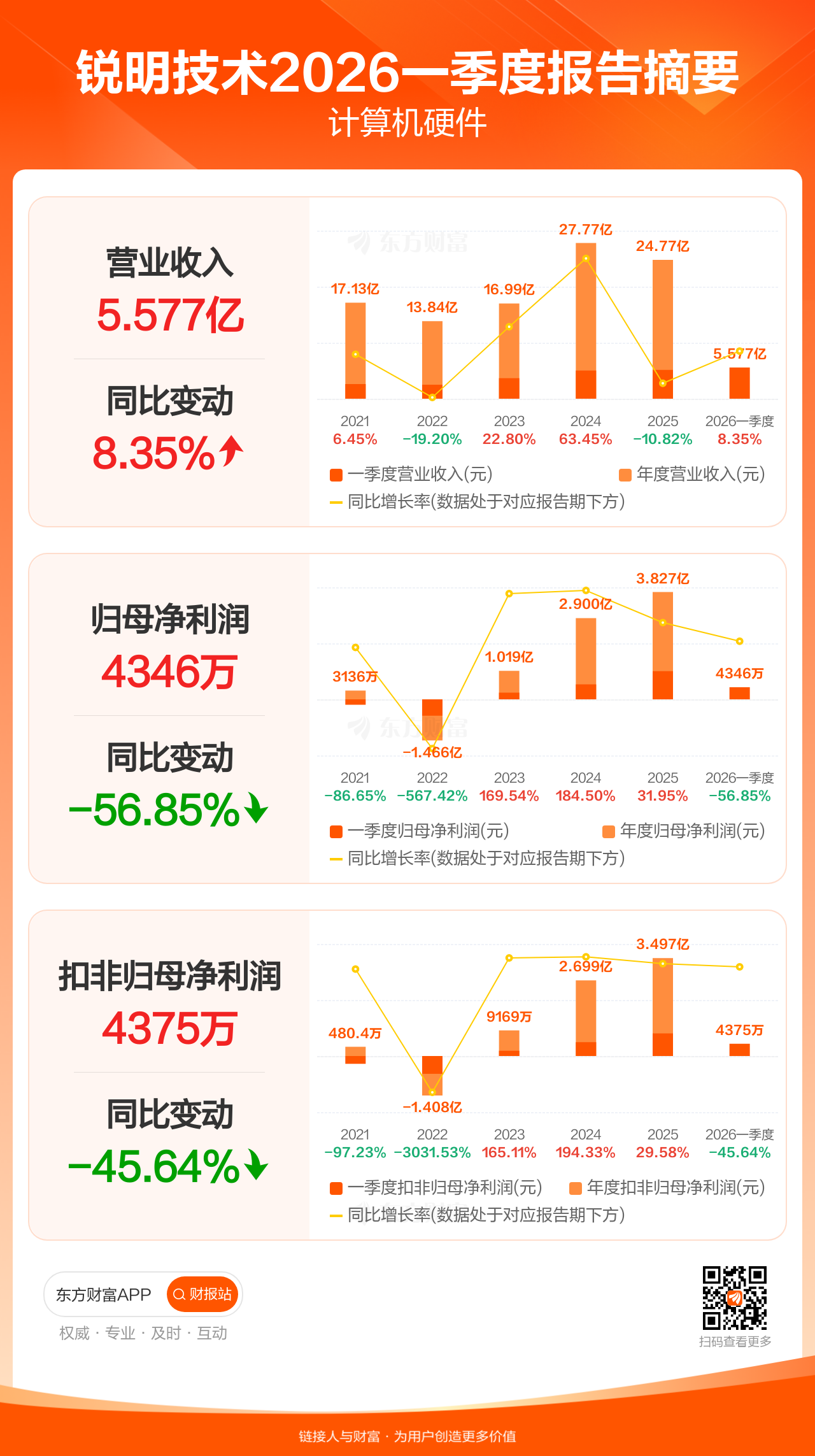 锐明技术4月28日发布2026年一季报显示,公司一季度实现营业收入5.58亿元,同比增长8.35%;归母净利润4346.33万元,同比下滑56.85%;扣非归母净利润4374.81万元,同比下滑45.64%。