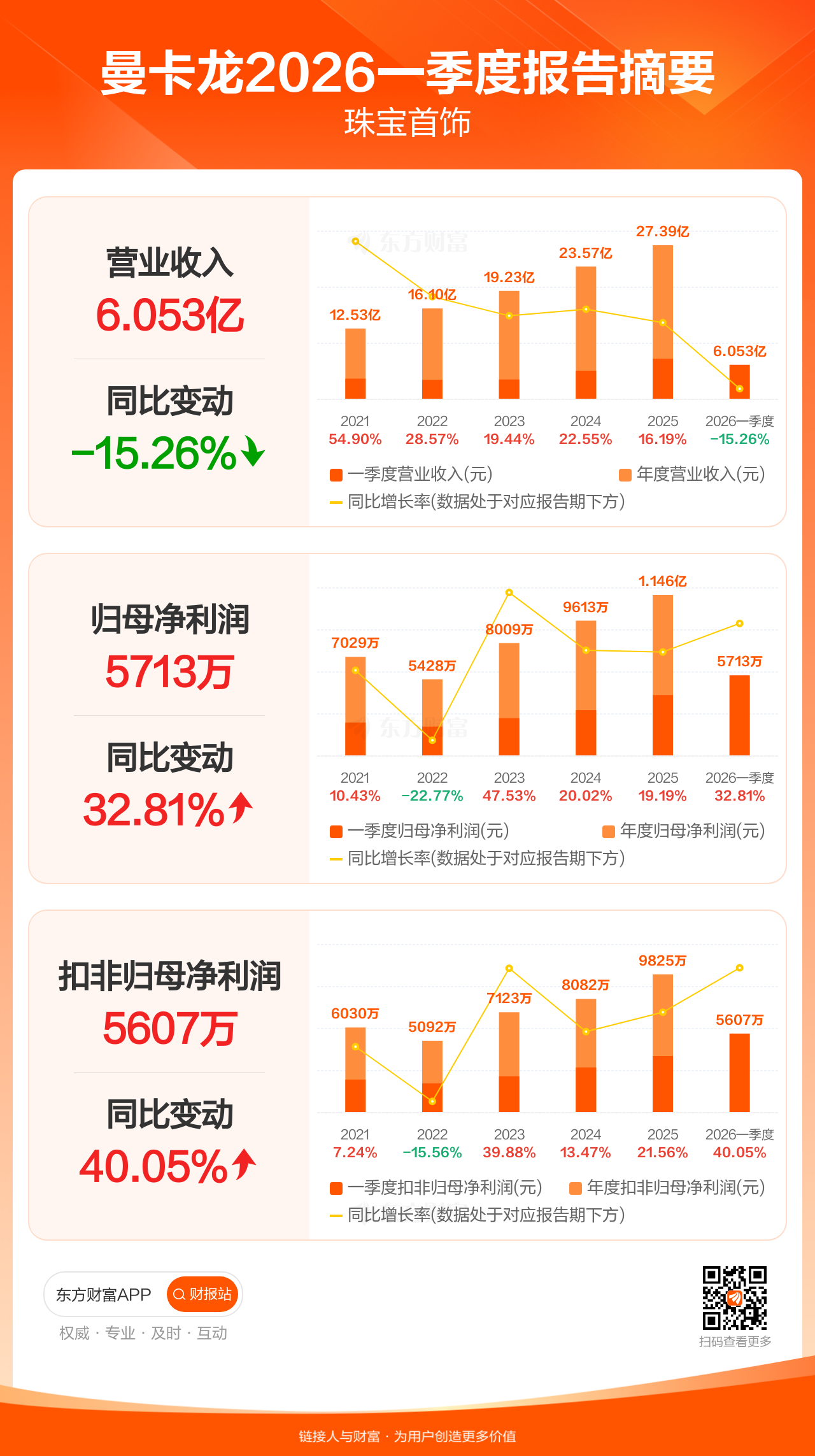曼卡龙4月28日发布2026年一季报显示,公司一季度实现营业收入6.05亿元,同比下滑15.26%;归母净利润5712.90万元,同比增长32.81%;扣非归母净利润5606.84万元,同比增长40.05%。