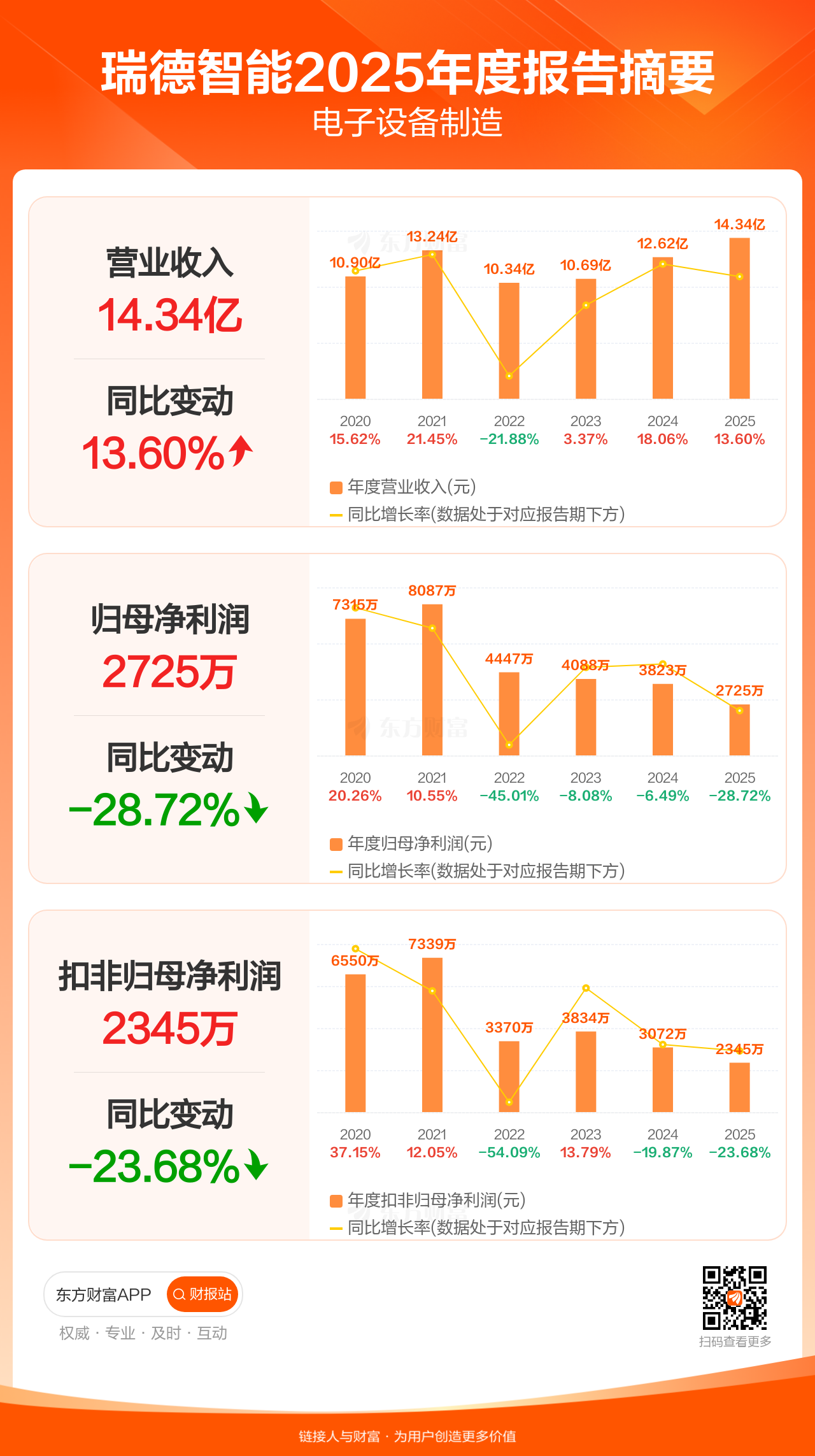 瑞德智能4月28日发布2025年年报显示,公司全年实现营业收入14.34亿元,同比增长13.60%;归母净利润2724.78万元,同比下滑28.72%;扣非归母净利润2344.78万元,同比下滑23.68%。
