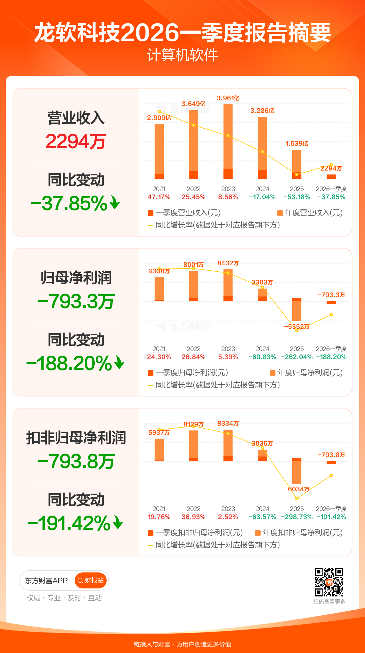龙软科技4月28日发布2026年一季报显示,公司一季度实现营业收入2293.64万元,同比下滑37.85%;归母净利润-793.28万元;扣非归母净利润-793.82万元。