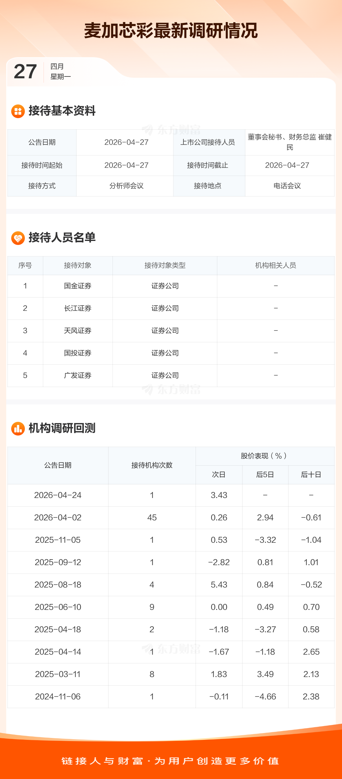 麦加芯彩4月27日公告称,4月27日接待国金证券等5家机构调研。接待人员包括董事会秘书、财务总监 崔健民。