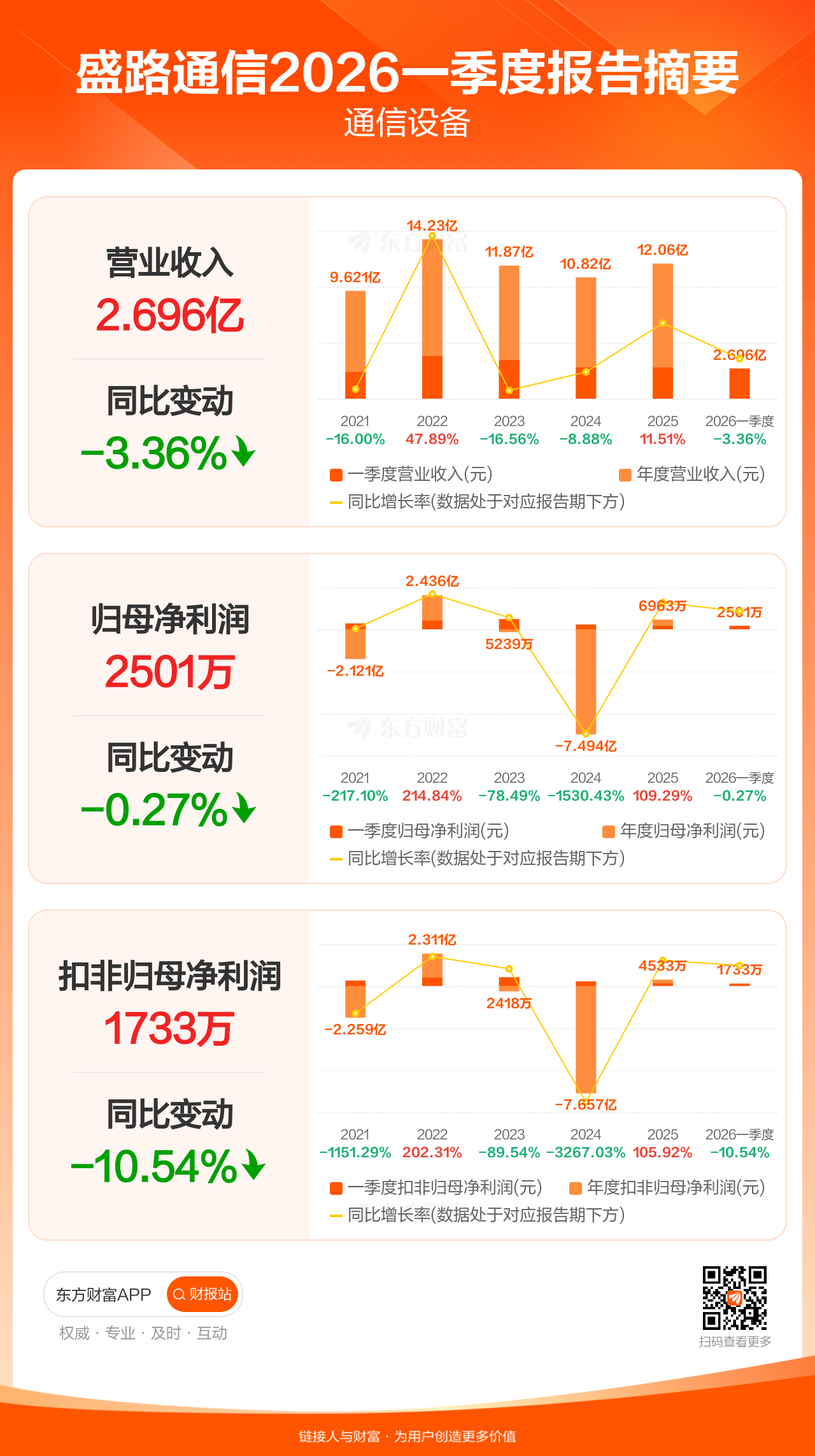 盛路通信4月28日发布2026年一季报显示,公司一季度实现营业收入2.70亿元,同比下滑3.36%;归母净利润2500.87万元,同比下滑0.27%;扣非归母净利润1732.54万元,同比下滑10.54%。
