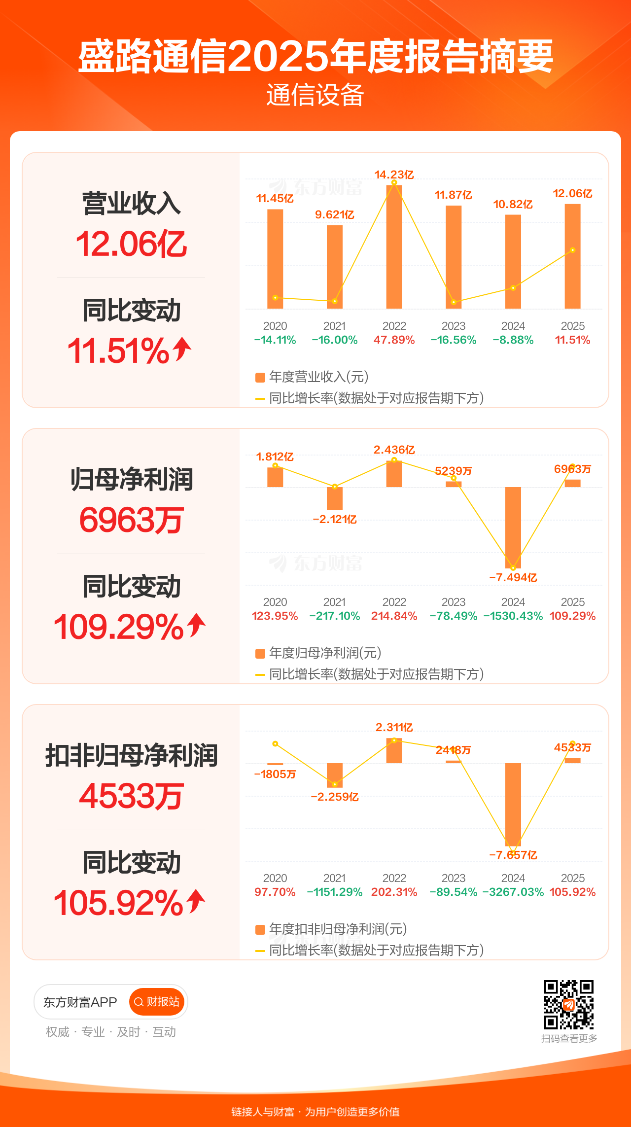 盛路通信4月28日发布2025年年报显示,公司全年实现营业收入12.06亿元,同比增长11.51%;归母净利润6962.94万元,同比增长109.29%;扣非归母净利润4532.82万元,同比增长105.92%。