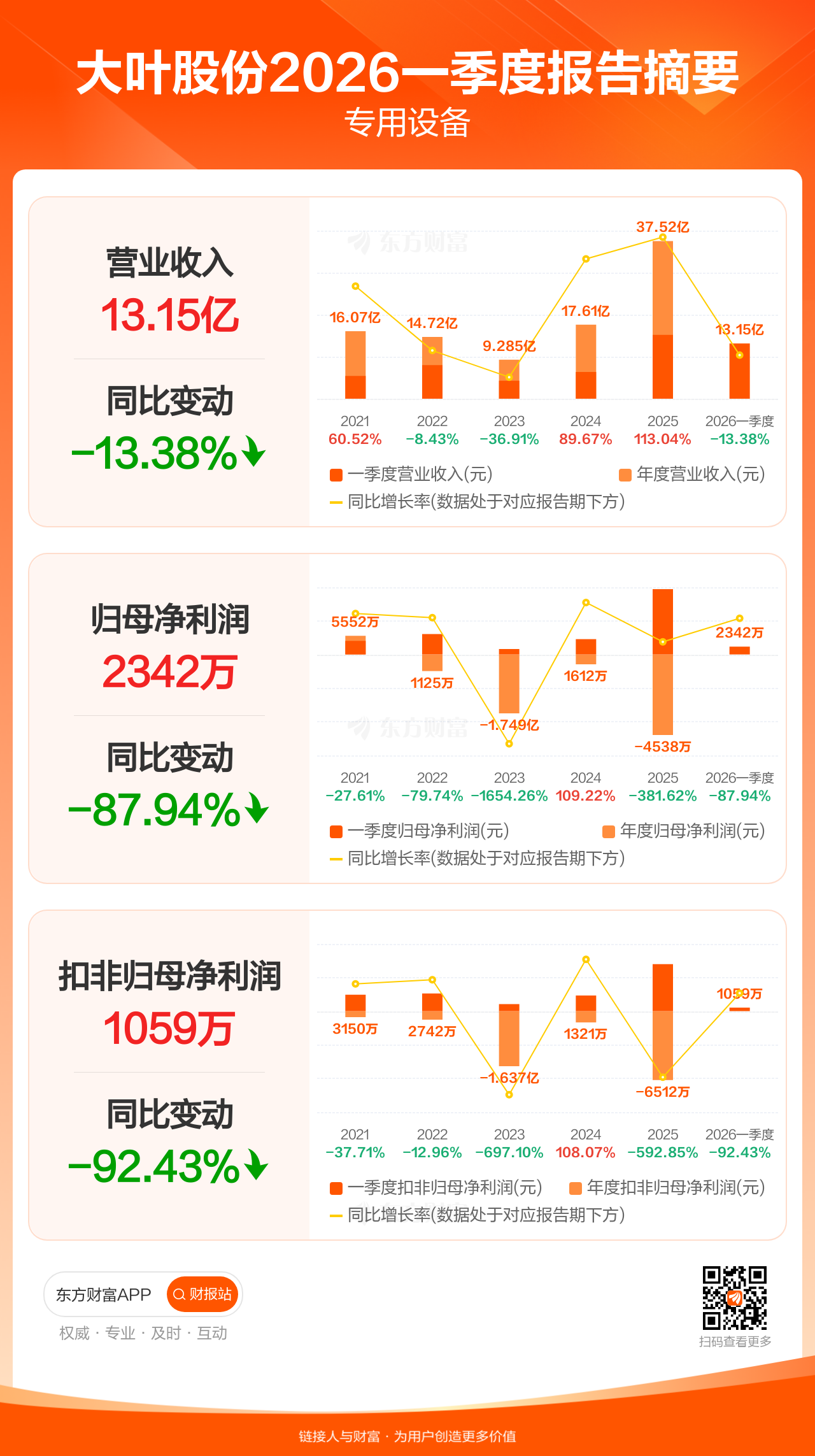 大叶股份4月28日发布2026年一季报显示,公司一季度实现营业收入13.15亿元,同比下滑13.38%;归母净利润2342.35万元,同比下滑87.94%;扣非归母净利润1058.80万元,同比下滑92.43%。