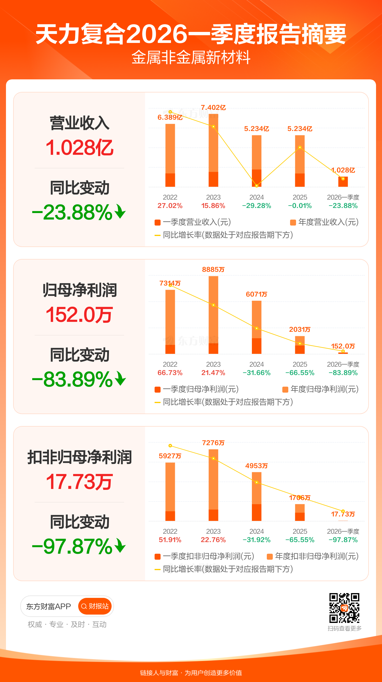 天力复合4月27日发布2026年一季报显示,公司一季度实现营业收入1.03亿元,同比下滑23.88%;归母净利润152.01万元,同比下滑83.89%;扣非归母净利润17.73万元,同比下滑97.87%。