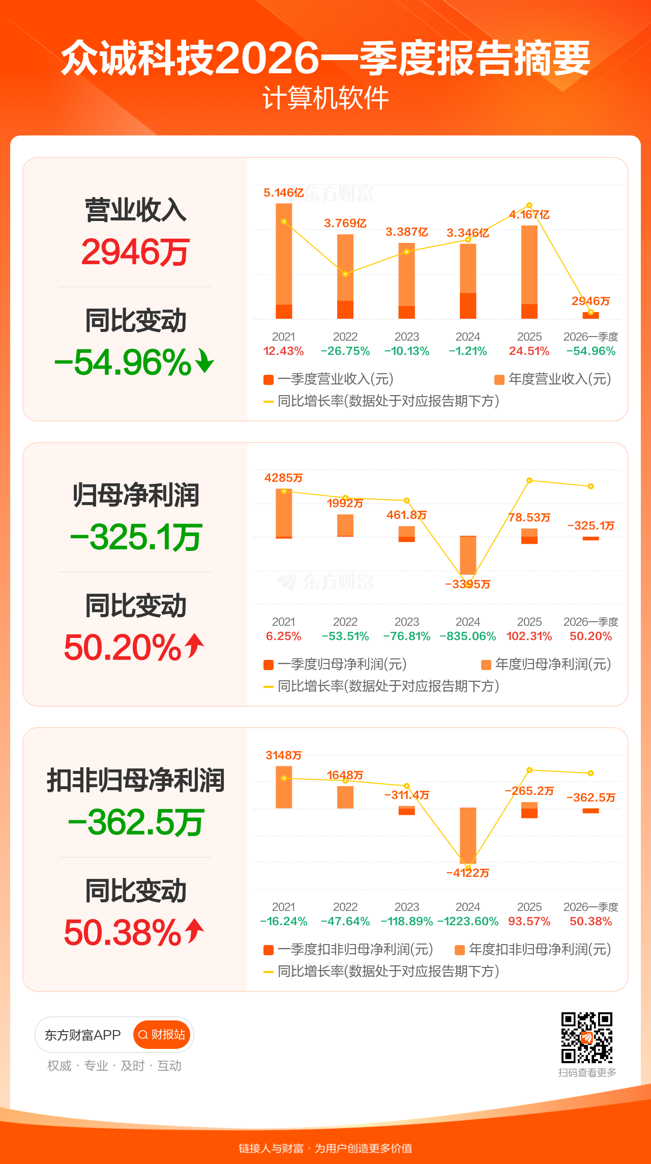 众诚科技4月27日发布2026年一季报显示,公司一季度实现营业收入2946.18万元,同比下滑54.96%;归母净利润-325.05万元;扣非归母净利润-362.55万元。