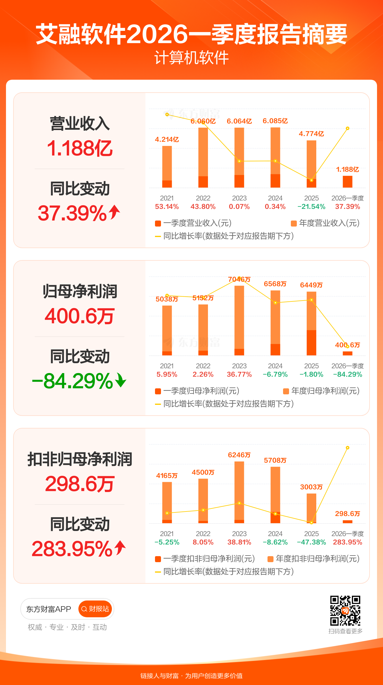 艾融软件4月27日发布2026年一季报显示,公司一季度实现营业收入1.19亿元,同比增长37.39%;归母净利润400.62万元,同比下滑84.29%;扣非归母净利润298.61万元,同比增长283.95%。