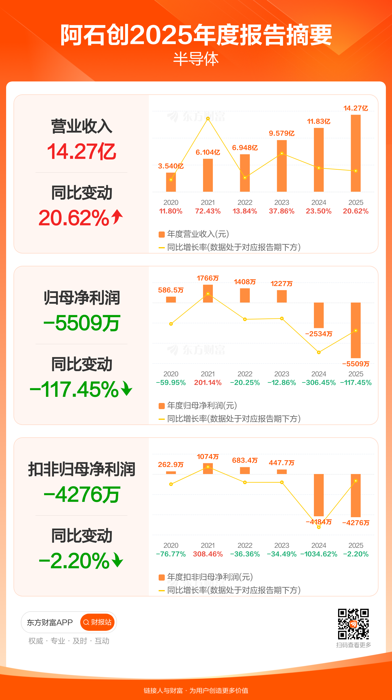 阿石创4月28日发布2025年年报显示,公司全年实现营业收入14.27亿元,同比增长20.62%;归母净利润-5509.37万元;扣非归母净利润-4276.06万元。