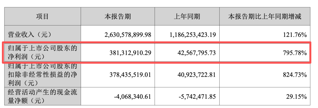 4月27日晚间,章源钨业(002378)发布一季报,公司2026年第一季度实现营业收入26.31亿元,同比增长121.76%;净利润3.81亿元,同比增长795.78%;扣非净利润 3.78 亿元,同比增幅达824.73%。