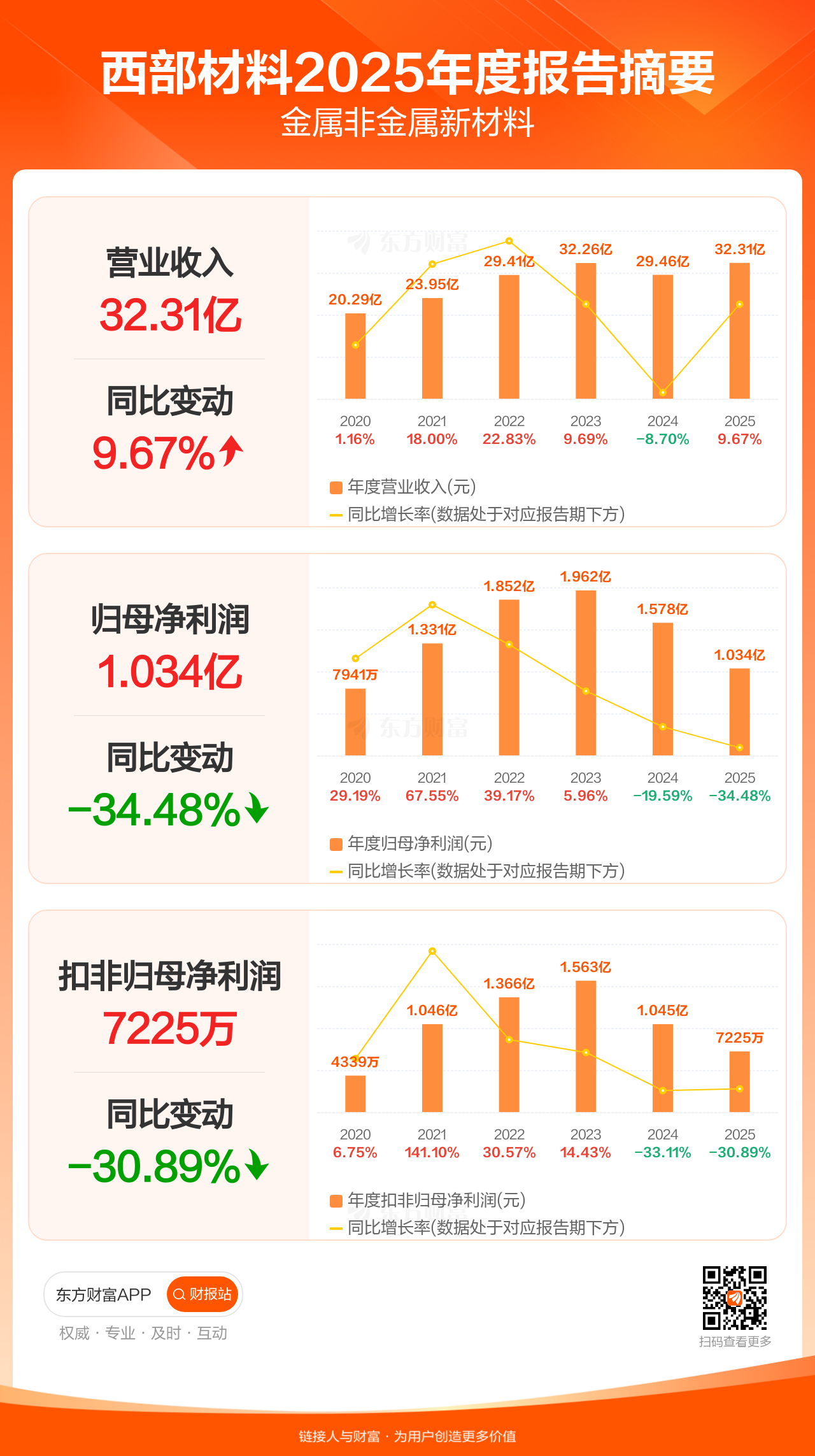 西部材料4月28日发布2025年年报显示,公司全年实现营业收入32.31亿元,同比增长9.67%;归母净利润1.03亿元,同比下滑34.48%;扣非归母净利润7224.95万元,同比下滑30.89%。