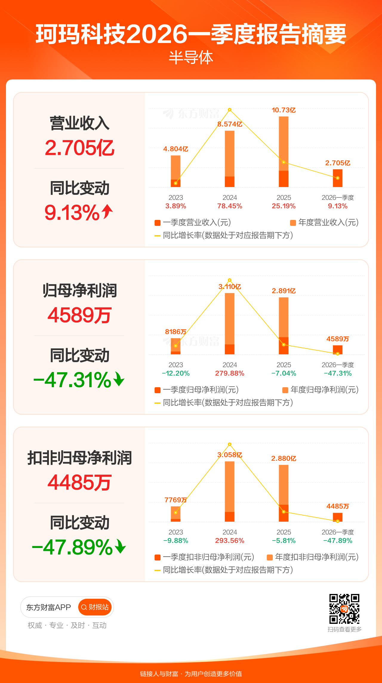 珂玛科技4月28日发布2026年一季报显示,公司一季度实现营业收入2.71亿元,同比增长9.13%;归母净利润4588.74万元,同比下滑47.31%;扣非归母净利润4484.90万元,同比下滑47.89%。