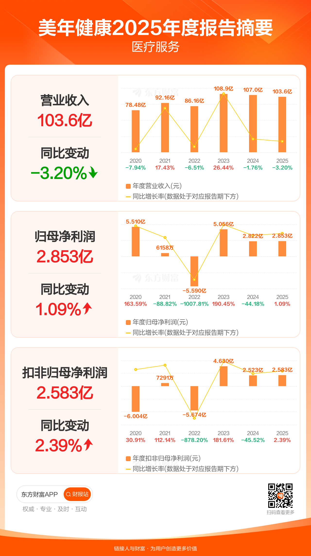 美年健康4月28日发布2025年年报显示,公司全年实现营业收入103.60亿元,同比下滑3.20%;归母净利润2.85亿元,同比增长1.09%;扣非归母净利润2.58亿元,同比增长2.39%。