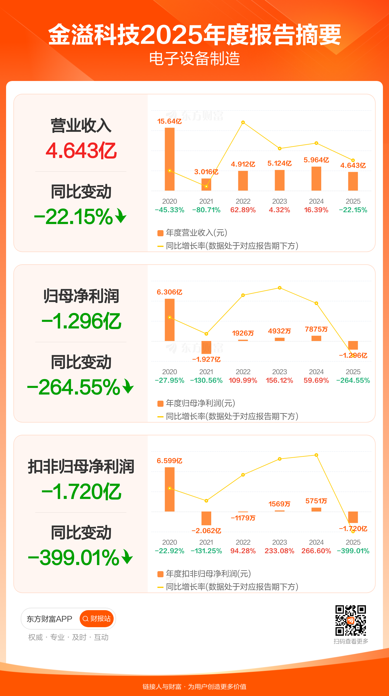 金溢科技4月28日发布2025年年报显示,公司全年实现营业收入4.64亿元,同比下滑22.15%;归母净利润-1.30亿元;扣非归母净利润-1.72亿元。