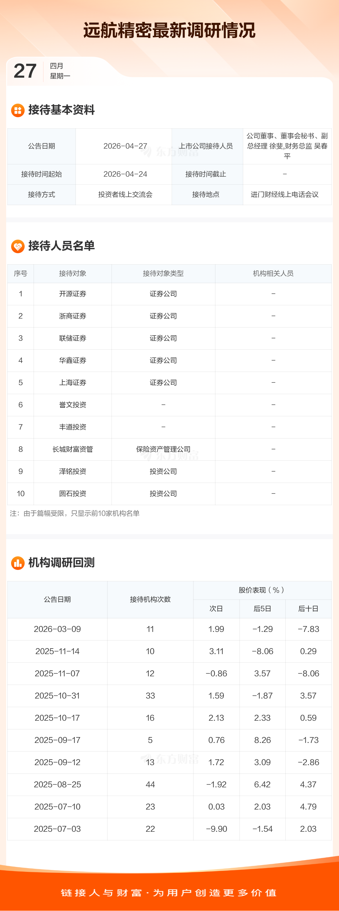 远航精密4月27日公告称,4月24日接待开源证券等42家机构调研。接待人员包括公司董事、董事会秘书、副总经理 徐斐,财务总监 吴春平。