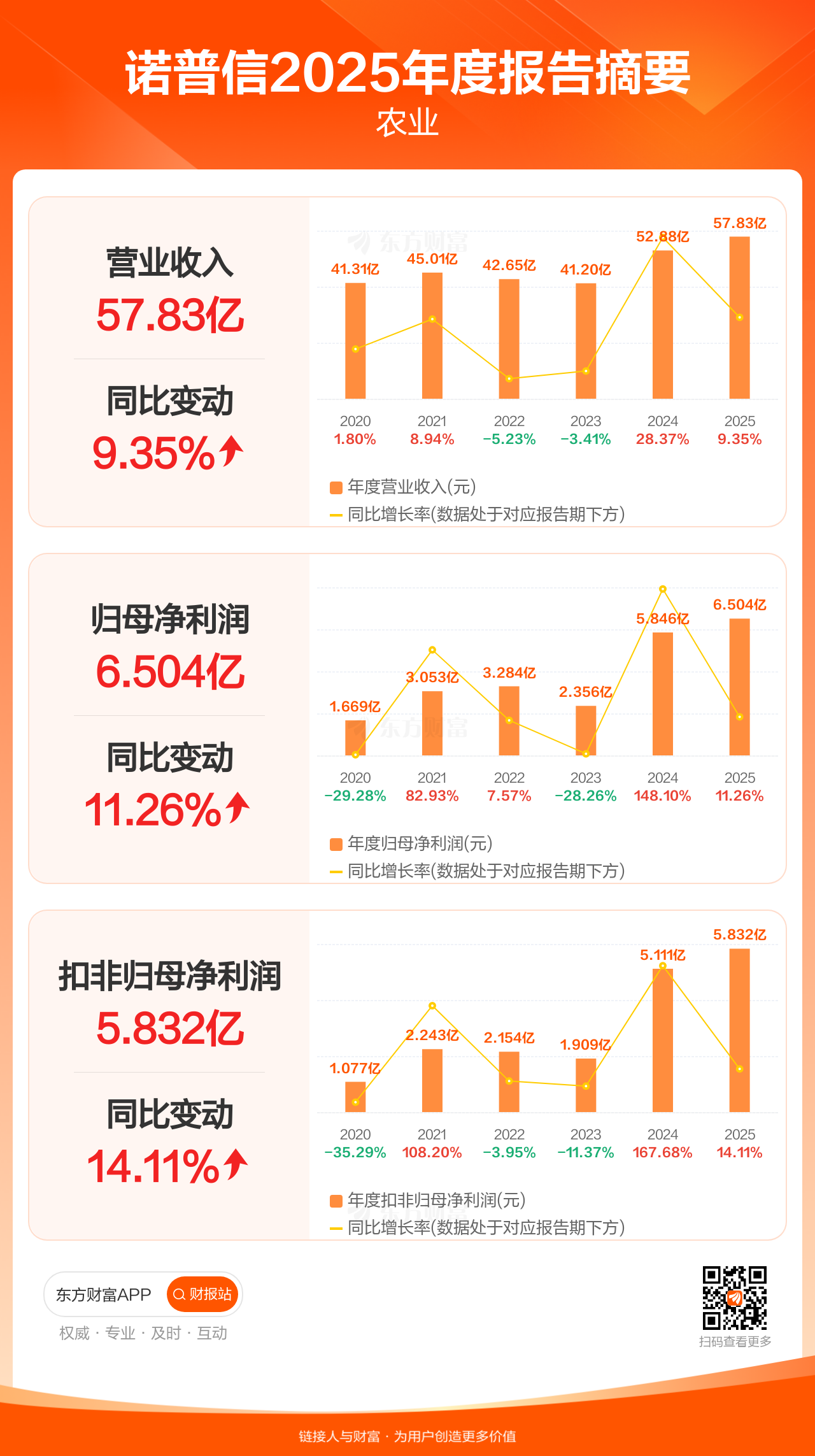 诺普信4月28日发布2025年年报显示,公司全年实现营业收入57.83亿元,同比增长9.35%;归母净利润6.50亿元,同比增长11.26%;扣非归母净利润5.83亿元,同比增长14.11%。