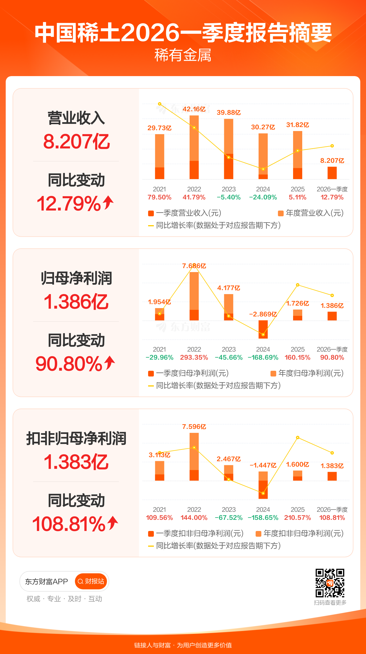 中国稀土4月28日发布2026年一季报显示,公司一季度实现营业收入8.21亿元,同比增长12.79%;归母净利润1.39亿元,同比增长90.80%;扣非归母净利润1.38亿元,同比增长108.81%。