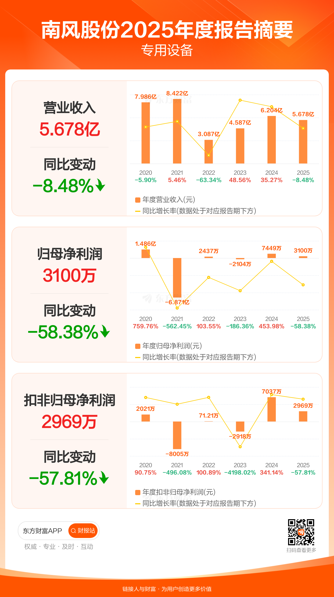 南风股份4月28日发布2025年年报显示,公司全年实现营业收入5.68亿元,同比下滑8.48%;归母净利润3100.23万元,同比下滑58.38%;扣非归母净利润2969.15万元,同比下滑57.81%。