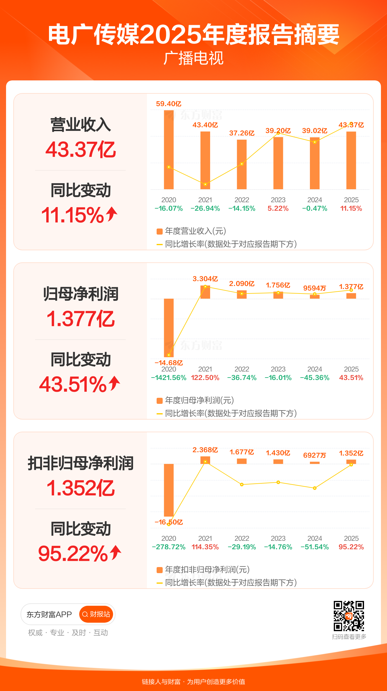 电广传媒4月28日发布2025年年报显示,公司全年实现营业收入43.37亿元,同比增长11.15%;归母净利润1.38亿元,同比增长43.51%;扣非归母净利润1.35亿元,同比增长95.22%。