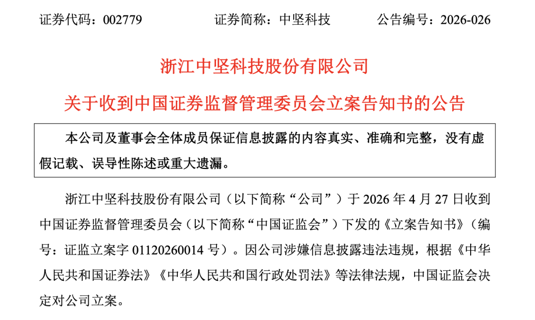 4月27日晚间,中坚科技发布公告称,公司收到中国证监会下发的《立案告知书》,因涉嫌信息披露违法违规,证监会决定对公司立案。