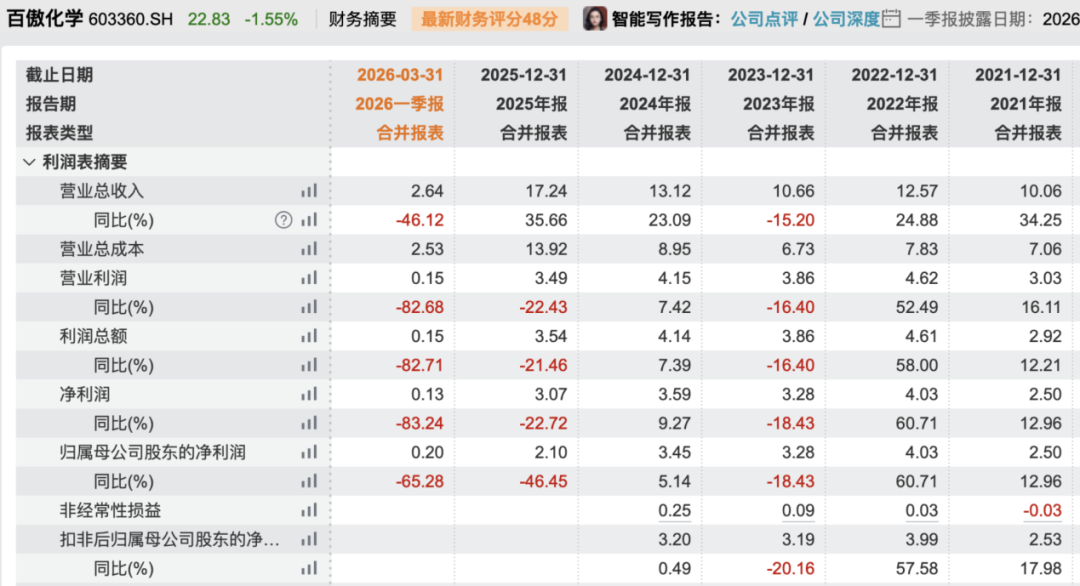 同日,百傲化学还发布了2025年年度报告及2026年一季报。根据公告,百傲化学2025年实现营业收入17.24亿元,同比增长35.66%;归母净利润为2.10亿元,同比下降46.45%。