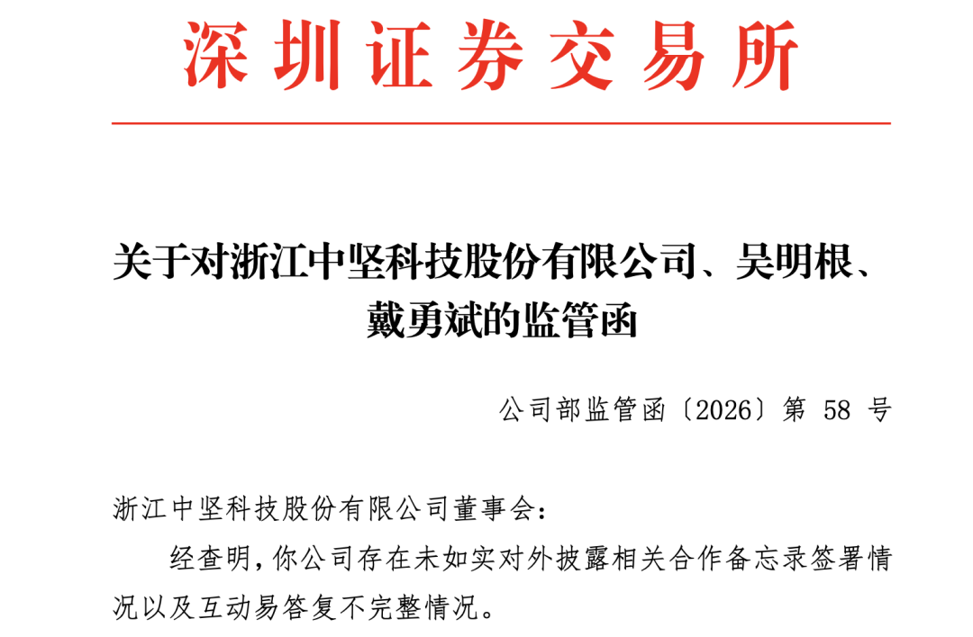 同日,中坚科技收到中国证监会浙江监管局下发的警示函。经查明,中坚科技2025年度存在相关合作备忘录签署事项信息披露不准确、互动易答复不完整的情况。公司上述行为违反了《上市公司信息披露管理办法》(证监会令第182号)第三条第一款,公司董事长兼总经理吴明根、时任董事会秘书戴勇斌违反了《上市公司信息披露管理办法》(证监会令第182号)第四条、第五十一条第二款规定,对上述违规行为承担主要责任。