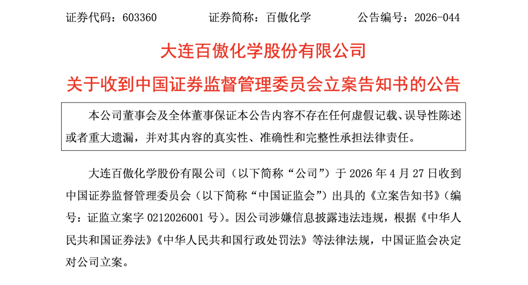 4月27日,百傲化学发布公告称,公司收到中国证监会出具的《立案告知书》。