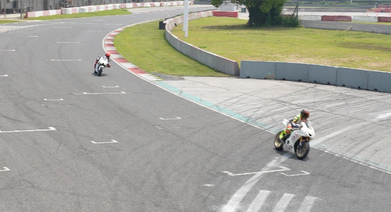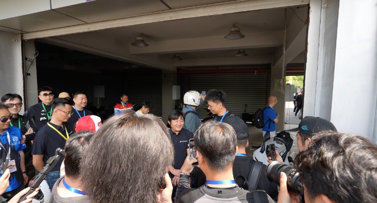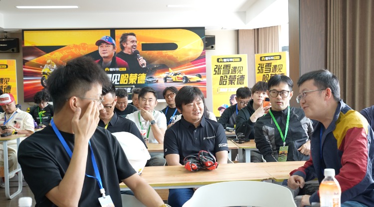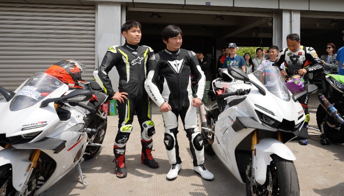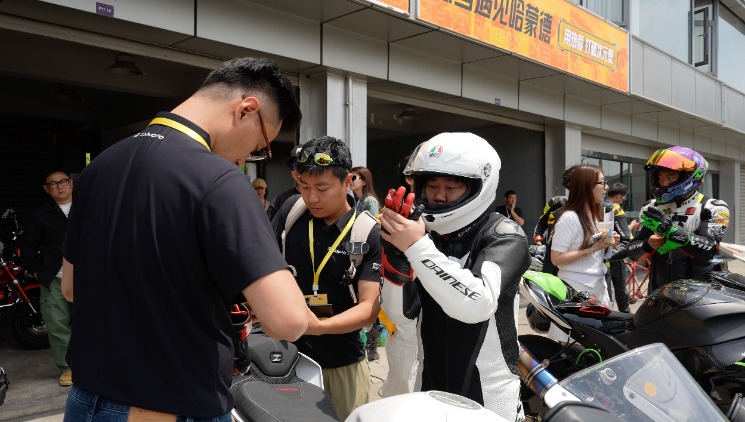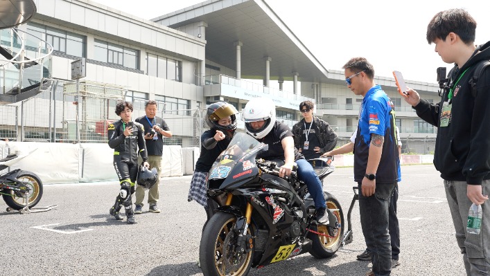 这是张雪参加的一场由懂车帝趣玩车策划的赛车活动。在安全指导下,他与现场摩托车爱好者在专业赛场进行试骑。